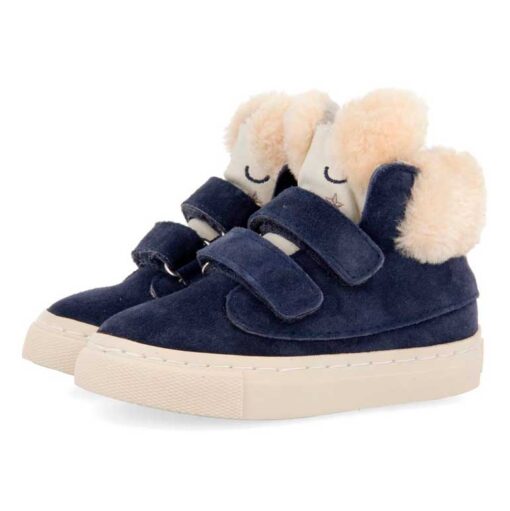 Botín de la marca Gioseppo en azul marino. Esta preciosidad de botín gustará tanto a la niñas como a los niños, ya que lleva el adorno de un muñeco en la lengueta del zapato. Con cierre de doble velcro para una mayor sujeción del pie