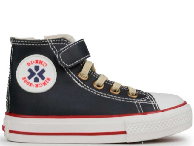 Deportivo marino de niño y niña. Botín deportivo de piel sintética de tacto suave, cordones elásticos y cinta ajustable. Parche lateral de goma y cremallera interior. Puntera y suela de goma.