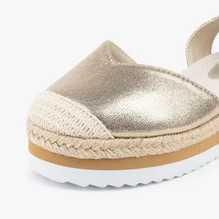 Las nuevas alpargatas de color platino y con acabado metálico. Tienen la suela cubierta de yute en el mismo tono y una suela de goma para garantizar la flexibilidad. También tienen cierre de hebilla que se sujeta con una pulsera alrededor del tobillo. ¡Podrás crear miles de looks e ir ideal en cualquier ocasión!