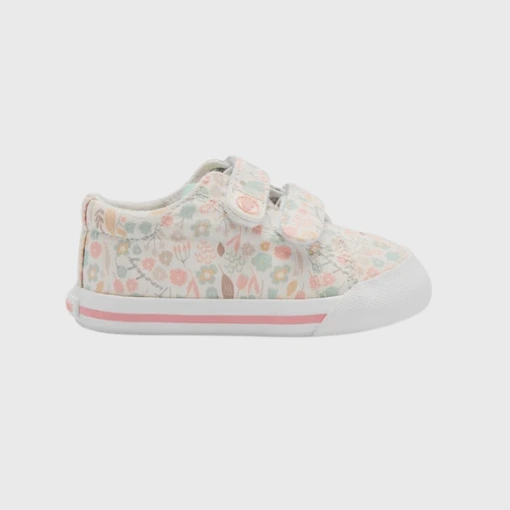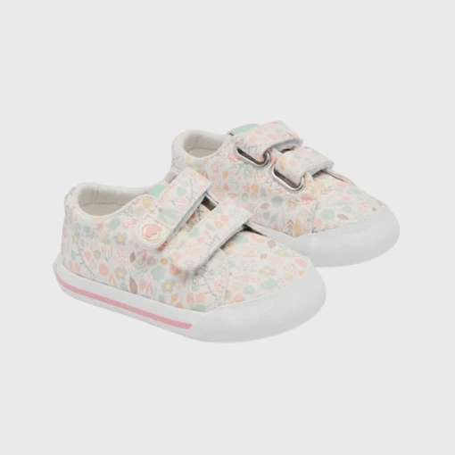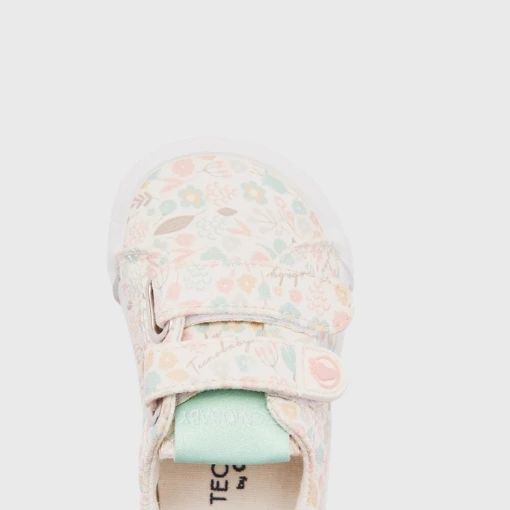 El estampado floral en tonos suaves combina con vestidos, vaqueros o conjuntos más neutros. La suela blanca con línea rosa aporta un toque dulce sin perder equilibrio.