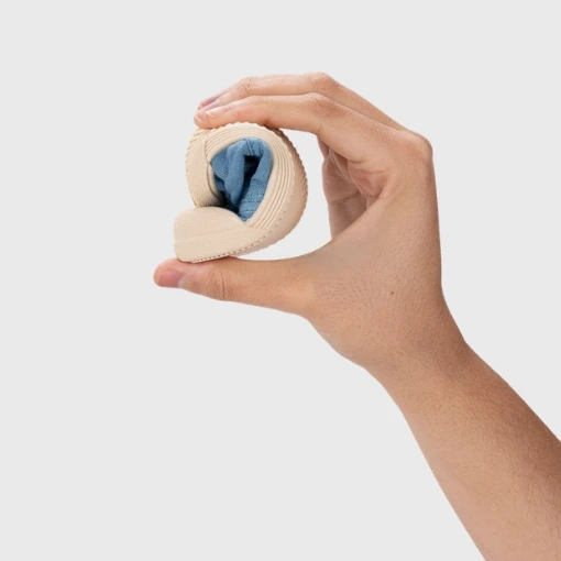 La suela es fina y muy flexible —como se aprecia en la imagen donde se enrolla completamente— lo que permite que el pie trabaje y se fortalezca sin interferencias.