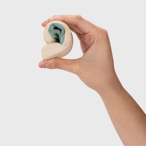 La suela es fina y extremadamente flexible —como se aprecia en la imagen donde se enrolla completamente— permitiendo que el pie se mueva con libertad y se fortalezca.