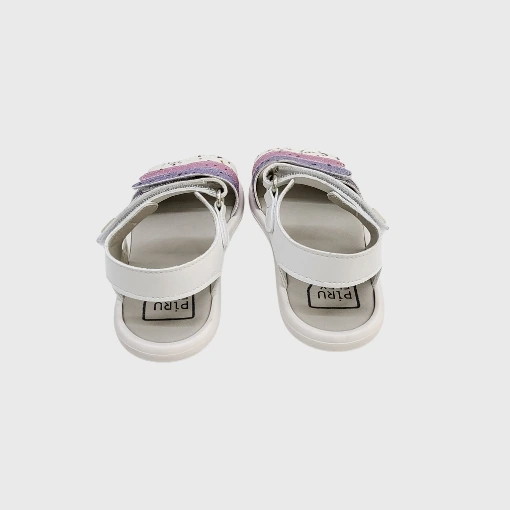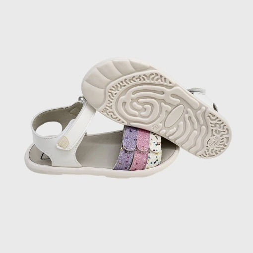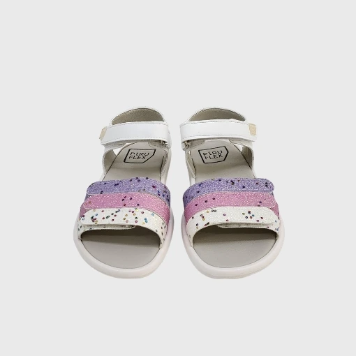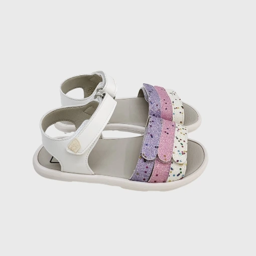 Combina una estructura barefoot con un diseño alegre en tonos lila, rosa y blanco con pequeños detalles brillantes que la hacen especial sin perder comodidad.