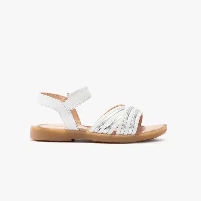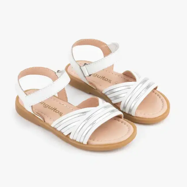 Sandalias de niña confeccionadas en piel de color blanco con tiras plateadas en la parte delantera. Tiene un cierre adhesivo mediante pulsera que se ajusta al tobillo y garantiza una total sujeción del pie. Además, su suela es de goma, lo que las convierte en unas sandalias de calidad, cómodas y flexibles.