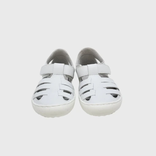 Una sandalia blanca respetuosa que combina funcionalidad y sencillez.