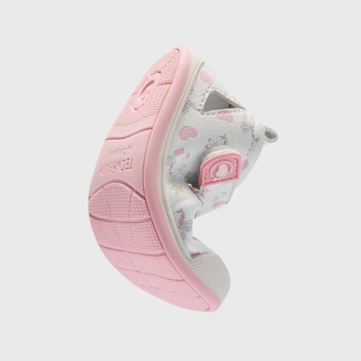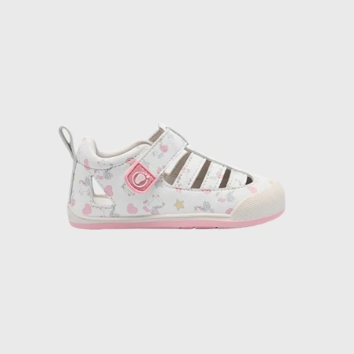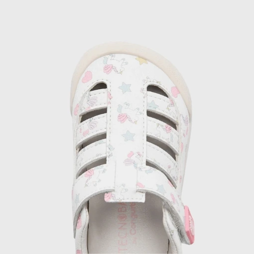 El estampado de unicornios en tonos suaves convierte esta sandalia en algo más que un calzado funcional.