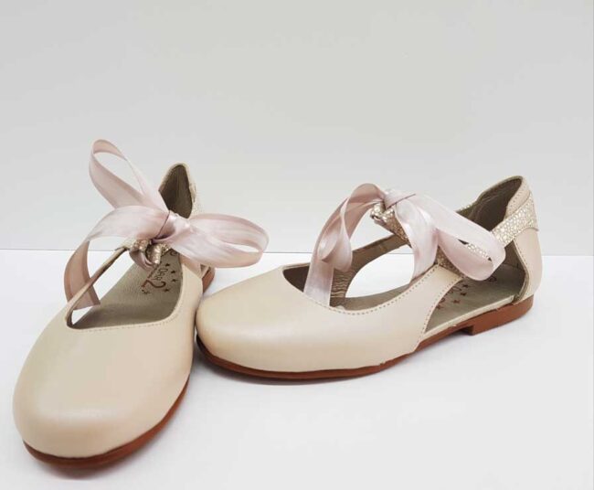 Zapato de ceremonia para niña en color beige de la marca Dar2. Fabricado en piel tanto el exterior como el interior. Con suela antideslizante y cierre de lazo en el empeine que hace que este modelo sea una preciosidad